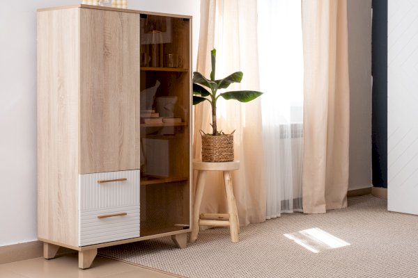 Стеллаж со стеклом — это практичное и дизайнерское решение для гостиной. Стеллаж имеет семь полок и два ящика. Ящики оснащены шариковыми направляющими полного выдвижения. Створки выполнены из ЛДСП и стекла, что позволяет хранить как необходимые предметы, так и предметы декора.
