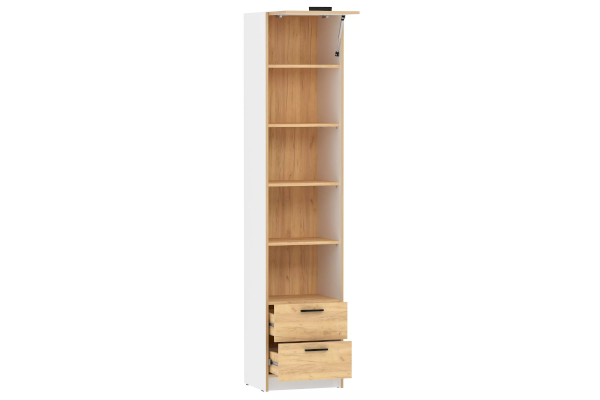 Шкаф оснащен полкой для хранения вещей, которая открывается с помощью газлифтов, которые которые фиксируют положение фасада в открытом виде, а также двумя выдвижными ящиками с шариковыми направляющими, за счет которых они выдвигаются плавно и бесшумно. Сочетание открытых и закрытых ниш добавляет легкости в интерьер, а также позволяет поместить красивую посуду или декор в видимой части изделия. Шкаф является модульным, что позволяет комбинировать его с другими шкафами и тумбами из одноименной коллекции. Лаконичный дизайн шкафа гармонично подчеркивается черными ручками.