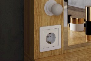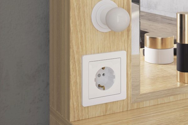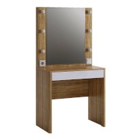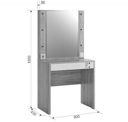 Оригинальное и стильное трюмо из серии «Зара». В зеркало с широким фацетом, встроена подсветка c 6 лампочками, как в столах профессиональных визажистов. Дополнительно имеется выключатель, розетка для фена и выдвижной ящик для украшений и косметики. Закругленные углы, подчеркивают общий стиль коллекции.