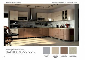 Специально для поклонников ультрасовременных интерьеров создан кухонный гарнитур «Хайтек». Мебель наделена всеми характеристиками этого стиля: стремительными линиями, монохромными цветами, глянцевыми поверхностями, минималисткой фурнитурой. Декоративные элементы не используются. Благодаря этим особенностям дизайна комплект не загромождает пространство.