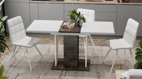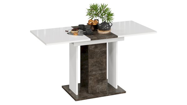 Стол имеет синхронный механизм раздвижения, позволяющий в разложенном виде разместить большое количество людей. Площадь столешницы увеличивается за счет центральной вставки, которая выполнена в декоре основания и двух колонн подстолья, и укладывается вручную.