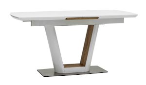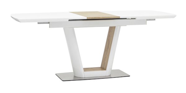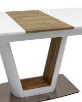 Обеденный стол раскладной. Столешница выполнена из прочного и долговечного МДФ. Столешница и ножка стола выполнены в едином стиле, светлая глянцевая поверхность идеально сочетается с деревянными вставками. Красивая форма стола позволит легко вписать его в современный интерьер, стол украсит кухню, гостиную или современное кафе, ресторан. Дополнительная вкладка стола выполнена из МДФ с бумажным шпоном цвета беленого дуба. На вкладке предусмотрена петля для комфортного открытия стола одной рукой.