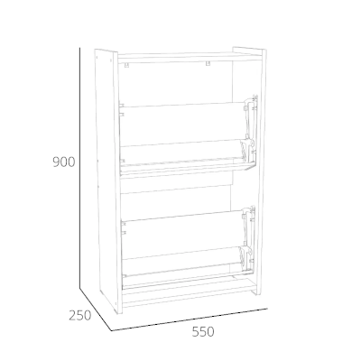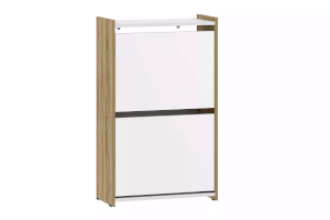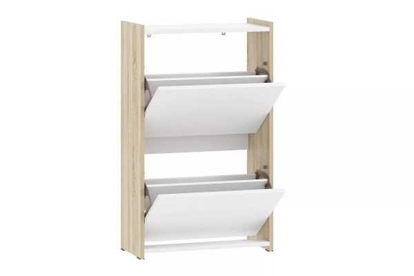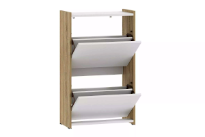 Тумба для обуви имеет стойкую конструкцию из двух закрытых секций с откидными полками, что позволяет хранить сезонную и повседневную обувь, а также убережет ее от пыли.