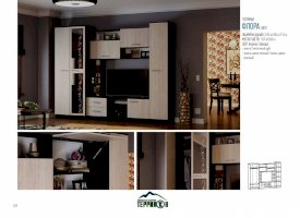 Универсальный дизайн и высокую функциональность объединила в себе гостиная «Флора». Она надежна и вместительна, рассчитана на долгие годы активной эксплуатации. Незамысловатое оформление гарнитура идеально гармонирует с современными интерьерами. Индивидуальность и немного шарма придают изделию цветочный орнамент на зеркале и ассиметрично расположенные открытые полочки.