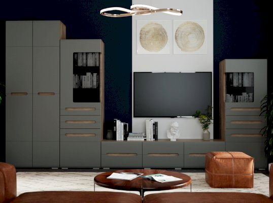 Модульная гостиная «Наоми» - это свежий одухотворенный интерьер, наполненный светом, комфортом и функциональностью. Уникальная геометрия фрезерованных фасадов создает атмосферу ультра-современности и минимализма. Контрастность сочетания матового декора корпуса элитного дерева «Дуб Каньон» с безмятежно-белыми глянцевыми створками относит нас к спокойствию, экологичности и безмятежности. Оригинальное конструктивное решение коллекции – ручки фасадов, выполненные путем сложной фрезеровки и подчеркнутые углубленным декором дубового спила.