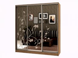 Данное изображение представлено в следующих цветах: корпус - Дуб Сонома, фасады - зеркало с пескоструйным рисунком, рамка двери и треки - Серебро матовое.