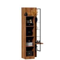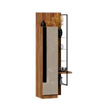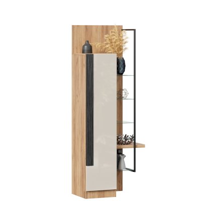 • Шкаф правый визуально разделен на две части – непосредственно шкаф (350х1500х391 мм) с 3 полками ЛДСП за распашной дверью (открывается всегда направо) и секцию с открытыми полками: 4 стеклополки (223х330 мм) и 1 полка из ЛДСП 32 мм (350х334 мм) – и декоративным металлическим кронштейном.