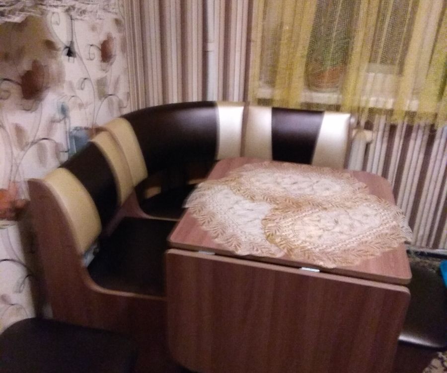 Кухонный стол со складной половиной столешницы в цвет корпуса углового кухонного дивана.