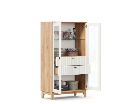 • За сборными распашными дверями со стеклом две стационарные горизонтальные перегородки и одна съемная стеклополка.