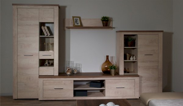 Стенка Мэдисон - это готовое решение для гостиной в современном европейском дизайне. Покрытие из ЭКОшпона повторяет фактуру и рисунок натурального дерева, устойчиво к износу. Крышки стенки, полки и ниша под телевизор выполнены из утолщенной плиты с мягкими безопасными краями. Мебель выполнена из экологически безопасных материалов.