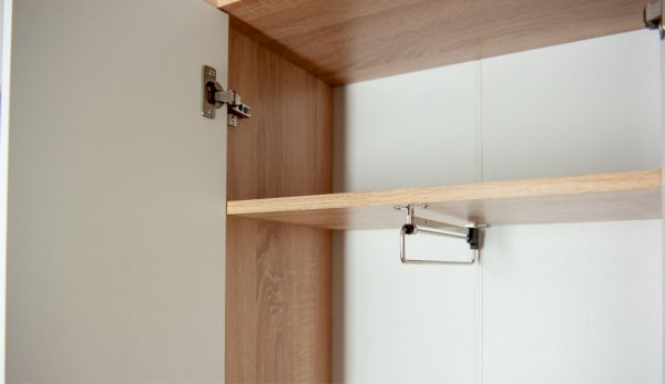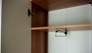 В шкафу установлена поперечная металлическая штанга и полки