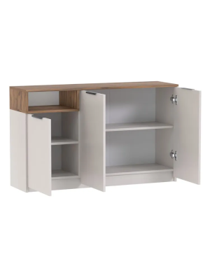 Наполнение: 3 распашных двери с разной стороной открывания + 1 открытая полка. За левой распашной дверцей расположена 1 полка, за двумя остальными – большая полка пошире на 2 отделения.
