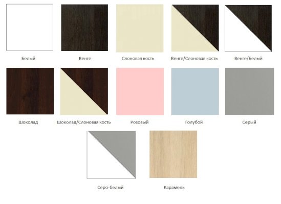 Цвета: белый, слоновая кость, венге, венге/слоновая кость, венге/белый, шоколад, шоколад/слоновая кость, розовый, голубой, серый, серо-белый, карамель
