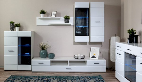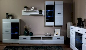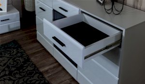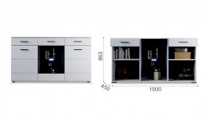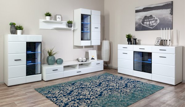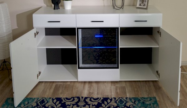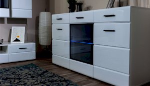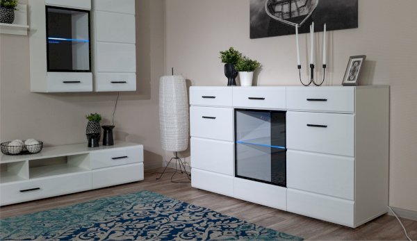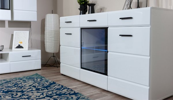 Белые глянцевые фасады МДФ и витрина с прозрачным стеклом сделают Вашу гостиную светлее и уютнее. Задняя стенка комода Йорк черного цвета красиво контрастирует с фасадами и корпусом белого цвета. Светодиодная подсветка сделает акцент на дорогих для Вас вещах, таких как фото, статуэтки или посуда. Комод оснащен всем необходимым для удобства использования, выдвижными ящиками на телескопических направляющих и закрытыми полками. Выполнен из экологически безопасных материалов.