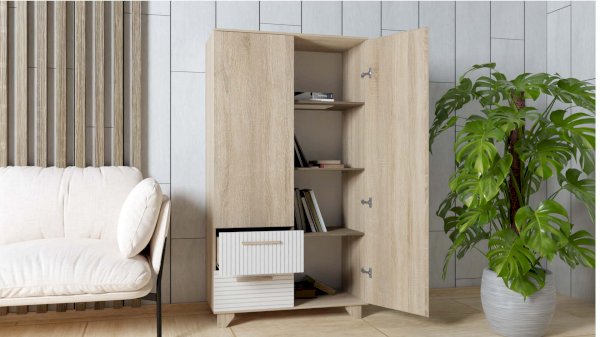 Створки оснащены петлями с доводчиками, ящики — шариковыми направляющими полного выдвижения и ручками из натурального массива дуба. В конструкции стеллажа предусмотрен механизм открывания нажатием «push-to-open».