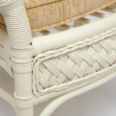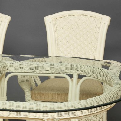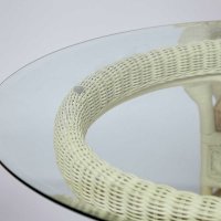 Материал: каркас - ротанг (высший сорт), мягкие элементы - ткань (хлопок+полиэстр) + наполнитель (холлофайбер), столешница - закалённое стекло