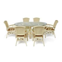 Элегантный обеденный комплект Secret De Maison ANDREA GRAND, состоящий из стола и шести кресел, выполнен вручную из натурального ротанга с использованием нескольких видов традиционного индонезийского плетения. Высокое качество и красота неповторимых плетеных узоров добавят благородства в ваш интерьер, подчеркнут вкус и статус своего владельца. Удобный стол, дополненный нижней полкой, со столешницей из закаленного стекла практичен и элегантен. Стекло обладает повышенной прочностью, долговечностью, способно многие годы не утрачивать своей первоначальной привлекательности. Удобные кресла с высокими подлокотниками и эргономичной спинкой обеспечат комфортную посадку для продолжительного отдыха. Тканевая обивка подушек проста в уходе, прослужит вам долгие годы, сохраняя свой первоначальный вид. Мебель покрыта прозрачным матовым лаком, устойчивым к УФ-излучению, она прочна, надежна, устойчива к повышенной влажности. Комплект идеально сочетается с мебелью из коллекции ANDREA, поставляется в собранном виде.