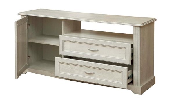 Тумбу предназначена под ТВ, но ее можно также использовать в пространстве гостиной, столовой или холла и наполнять по своему желанию – в зависимости от пространства и задач. На поверхности можно расположить телевизор, монитор, домашний кинотеатр или другую технику. Два закрытых отделения слева и два выдвижных ящика по центру делают тумбу вместительной и практичной. Каждая полка из ЛДСП выдерживает нагрузку до 5 кг. Тумбу можно поставить в холле и над ней повесить зеркало – получится лаконично и функционально. Красиво, но без излишеств. Глубина в 400 мм делает изделие компактным и вместительным одновременно. Благодаря современным технологиям дверцам и выдвижным ящикам не нужны доводчики – они легко и дружелюбно распахиваются и выдвигаются навстречу  по первому желанию хозяев. Шариковые направляющие обеспечивают очень плавный ход. Дверцы и ящики снабжены металлическими ручками, которые учитывают анатомию ладони, поэтому ими очень удобно пользоваться.