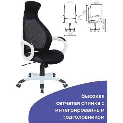Эргономика кресла выдержана на качественном уровне: высокая спинка с интегрированным подголовником, сетчатая спинка, поддерживающая поясницу, сиденье средней жесткости, широкие подлокотники с противоскользящими вставками.