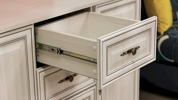 В комоде «Габриэлла» удачно сочетаются выдвижные ящики и две секции с полками из ЛДСП за глухими фасадами. Ящики оборудованы шариковыми направляющими. Полки выполнены в цвет корпуса. Каждая полка выдерживает нагрузку до 5 кг.
