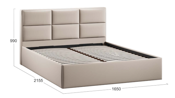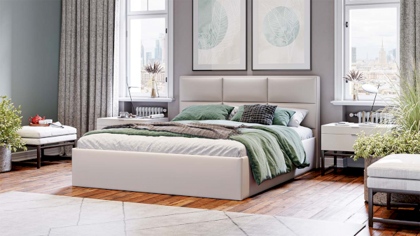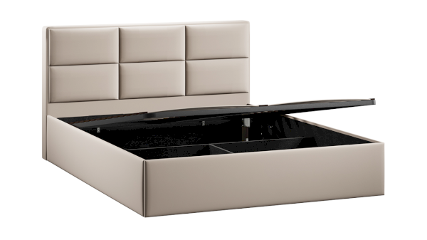Каркас кровати усилен поперечной и продольной опорами, что гарантирует максимальную устойчивость конструкции. Важной и функциональной деталью также является возможность рационального хранения, поэтому кровать оборудована подъемным механизмом, обеспечивающим верхнюю фиксацию и удобный доступ к месту для хранения.