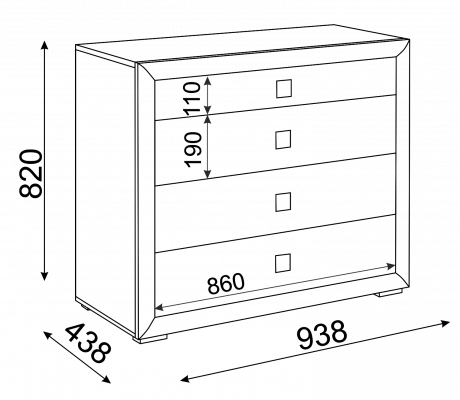 • Комод имеет 4 выдвижных ящика без разделителей.