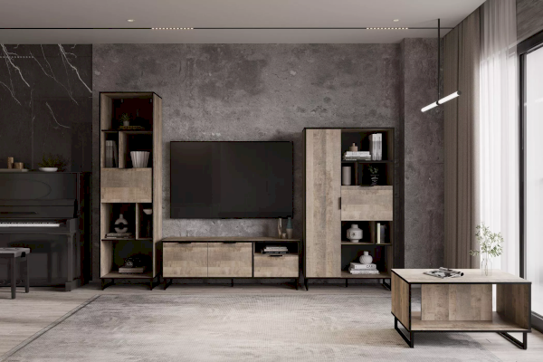 Комбинированный шкаф из коллекции ФОЛК легко впишется в интерьер гостиной в стиле Лофт, придав ей современный и монументальный вид. Черные лаконичные ручки и металлические опоры подчеркивают оригинальный дизайн мебели, а черная кромка эффектно выделяет фасад изделия.