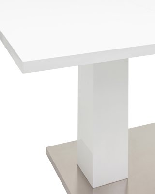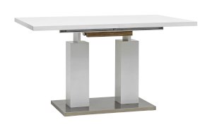 Обеденный стол раскладной. Столешница выполнена из прочного и долговечного МДФ. Светлая глянцевая поверхность столешницы гармонично сочетается с металлическими ножками. Простая прямоугольная форма стола позволит легко вписать его в современный интерьер, стол украсит кухню, гостиную или современное кафе, ресторан. Дополнительная вкладка стола выполнена из МДФ с бумажным шпоном цвета беленого дуба. На вкладке предусмотрена петля для комфортного открытия стола одной рукой.